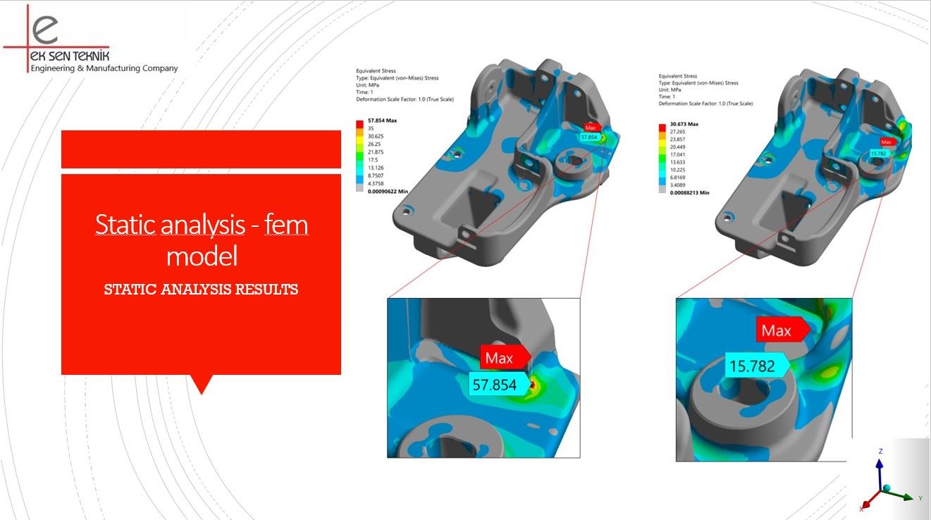 Structural analysis of the part is done by the fem method. The input model for the computation is made starting from the cad model adapted for the purpose. The casting manufacturing processes of the part, for example the mold exit angles, etc. and the design was made according to the machining process.